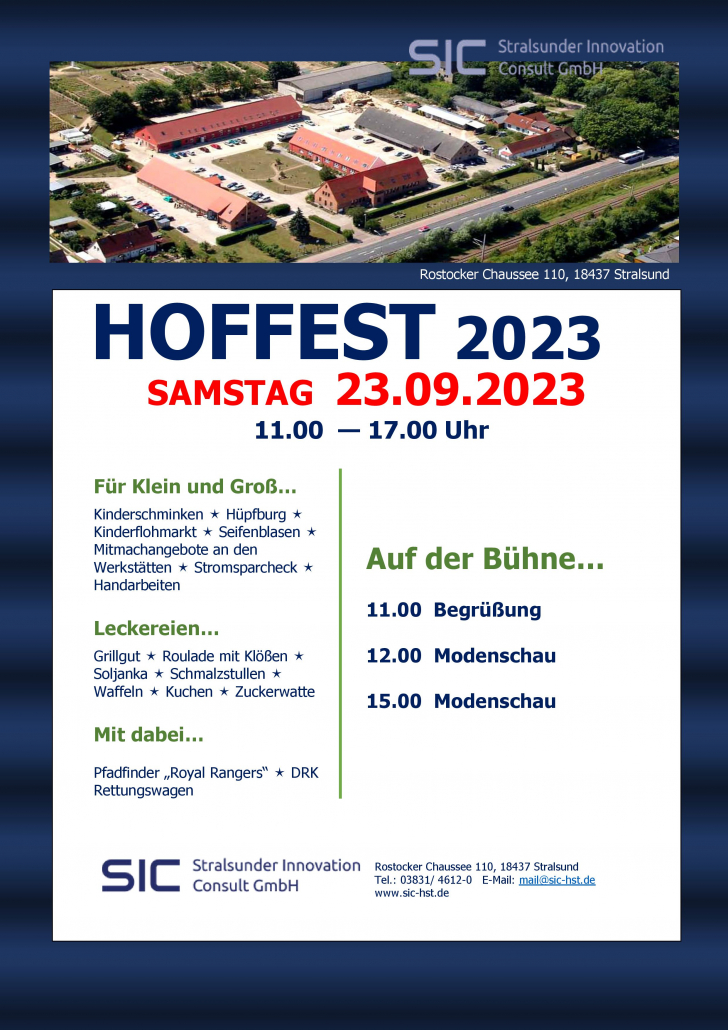 Das traditionelle Hoffest der SIC GmbH wird am 23.09.2023 von 11.00 bis 17.00 Uhr in der Rostocker Chaussee 110  stattfinden. Auf die Besucher wartet ein buntes Unterhaltungsprogramm. Die Kinder können sich auf spannende Mitmachangebote unserer Werkstätten, aufs Kinderschminken  und auf die Hüpfburg freuen. Vorgesehen sind weiterhin ein Kinderflohmarkt und die Übergabe eines Wunschbaumes der Kinder an die Institutionen der Stadt Stralsund. Neben dem guten Essen wird die Modenschau ein Highlight des Hoffestes werden. Weitere Angebote werden sein: der Stromsparcheck, das DRK mit einem Rettungswagen, der Informationsstand Royal Rangers (Pfadfinder) und unsere offenen Second Hand Kaufhäuser.
