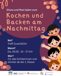 Am 26.11. laden Diana und Rosi alle Kinder ab dem 1. Schuljahr herzlich ein, gemeinsam einen fröhlichen Nachmittag im Treff Zuversicht zu verbringen. Unter dem Motto „Kochen und Backen“ wird geschnippelt, gerührt und natürlich auch genascht – Spaß und gute Laune sind garantiert!
